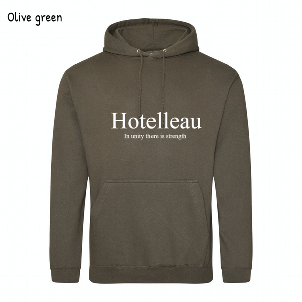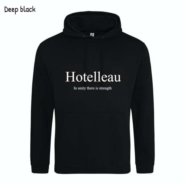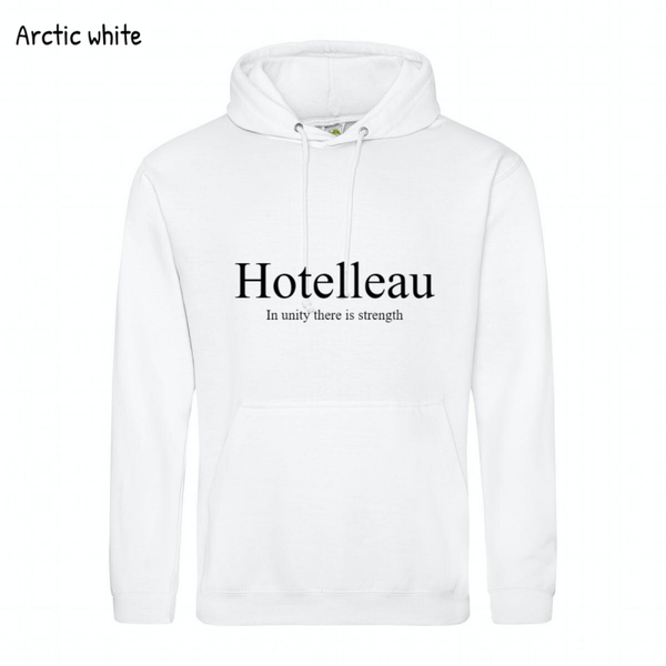 This is the official Hotelleau hoodie. The Hotelleau logo is on the front. Sizes are unisex and are, especially for woman, a bit bigger than average. With 80% cotton and 20% polyester, you are assured of a hoodie that stays Navy blue, even after washing all beer and wine stains off.